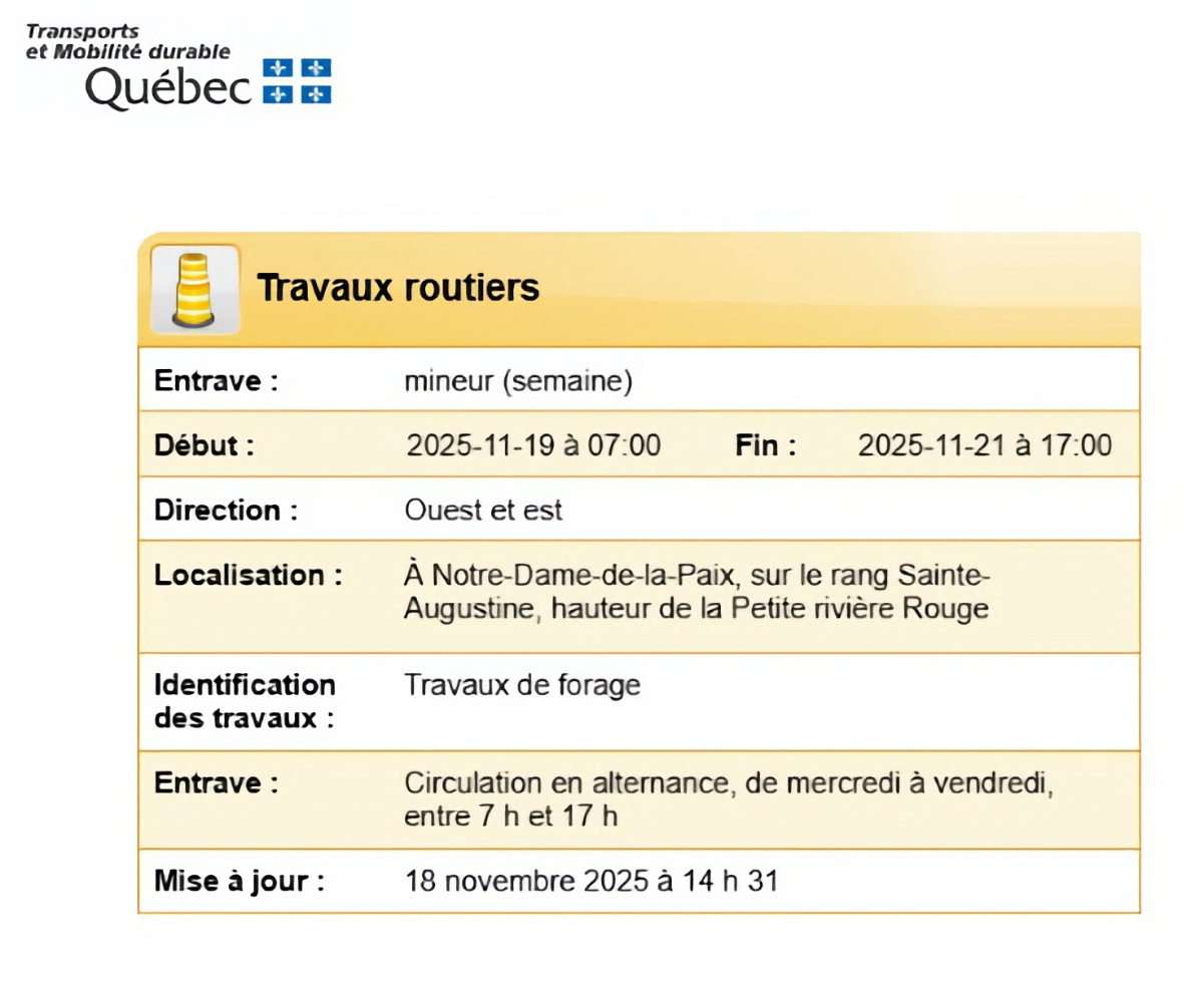 Travaux routiers 19 novembre 2025 Ces entraves peuvent être modifiées ou annulées en raison de contraintes opérationnellesou des conditions météorologiques. Consulter le lien Québec 511 pour en faire le sui